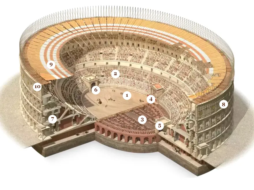 Las gradas del Coliseo, llamadas cavea, eran un reflejo de la jerarquía romana. Cuanto más alto, menor el rango social. Los senadores y nobles ocupaban las primeras filas, mientras que los plebeyos y esclavos se apiñaban en lo más alto, donde el sol y el polvo no daban tregua. En total, se estima que el anfiteatro podía albergar hasta 50.000 personas, todas unidas por un mismo objetivo, presenciar el espectáculo del poder.