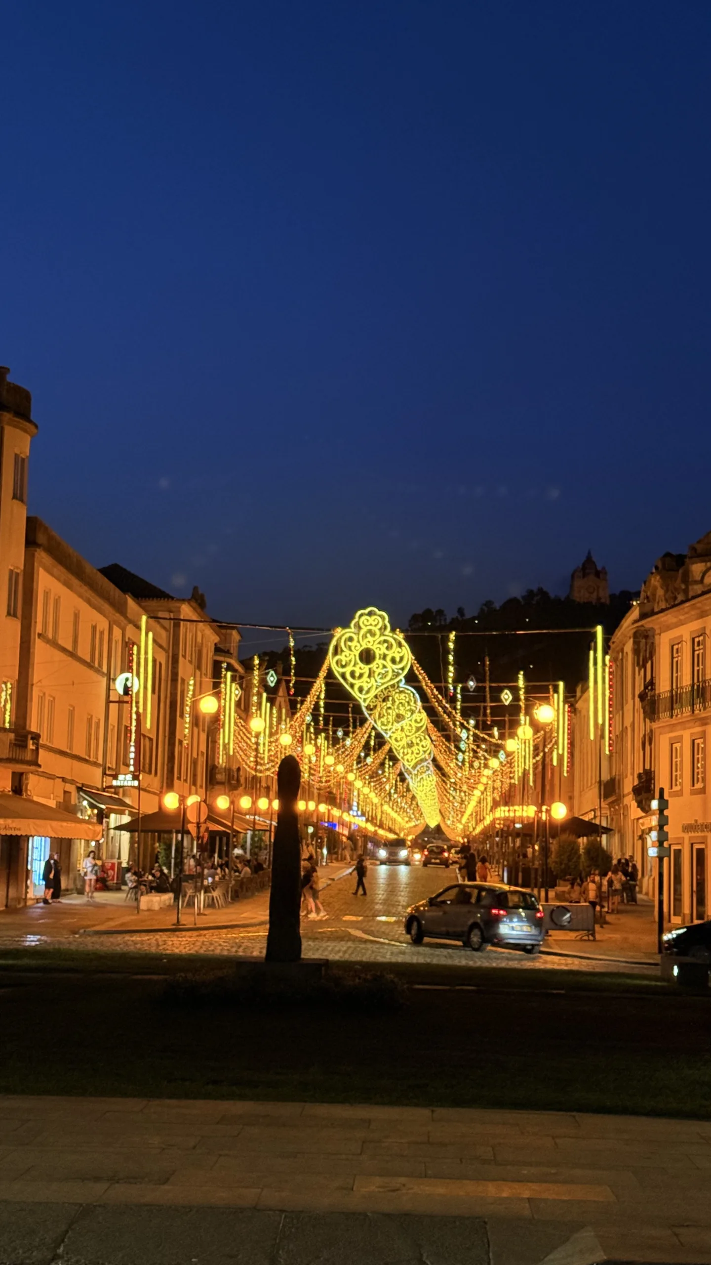 Paseamos por el puerto hasta el centro para dejarnos sorprender por la Praça da República, una plaza llena de vida donde aún pudimos ver muestras de bailes tradicionales y música tras las fiestas populares. De día la plaza es bonita, pero de noche se ilumina y brilla cada rincón. Su corazón es el logotipo representativo de Viana do Castelo, presente por toda la ciudad, al cual Antonio tomó foto a todas y cada uno (según yo porque voy a hacer un mural, pero si no lo veis en Instagram… pues eso 😅). Es una plaza ovalada con fuente lateral y una mezcla de edificios modernos y cargados de historia.