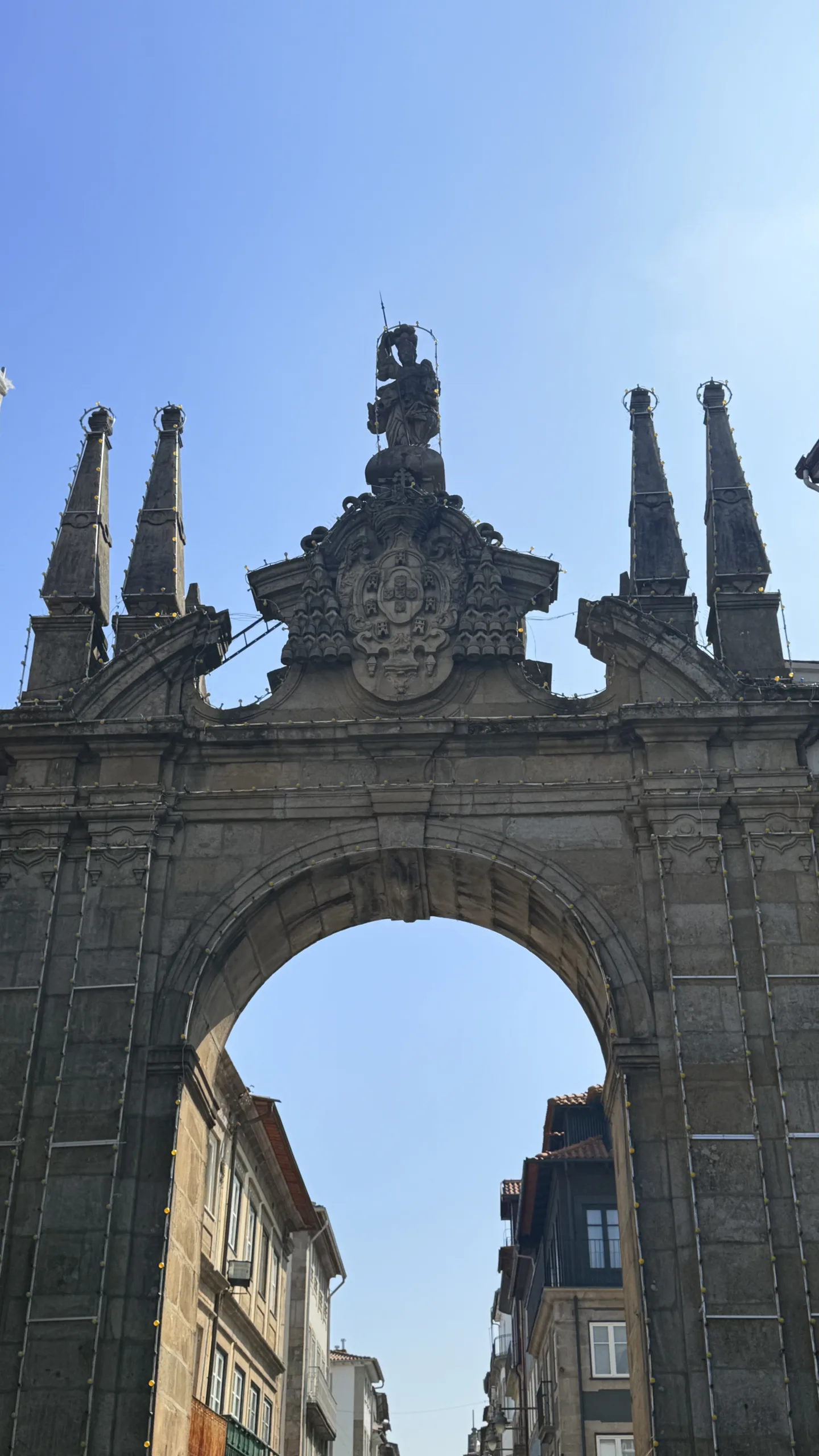 La primera parada fue bajo el Arco da Porta Nova, declarado Monumento Nacional. Este arco es curioso porque tiene dos caras muy diferentes, por un lado, cargado de detalles y adornos y por el otro, sencillo, con apenas una virgen en el centro. El guía nos explicó que el lado más trabajado era la entrada por donde pasaba el cuerpo religioso, mientras que el otro quedaba de espaldas, y por eso no se preocuparon demasiado en decorarlo.