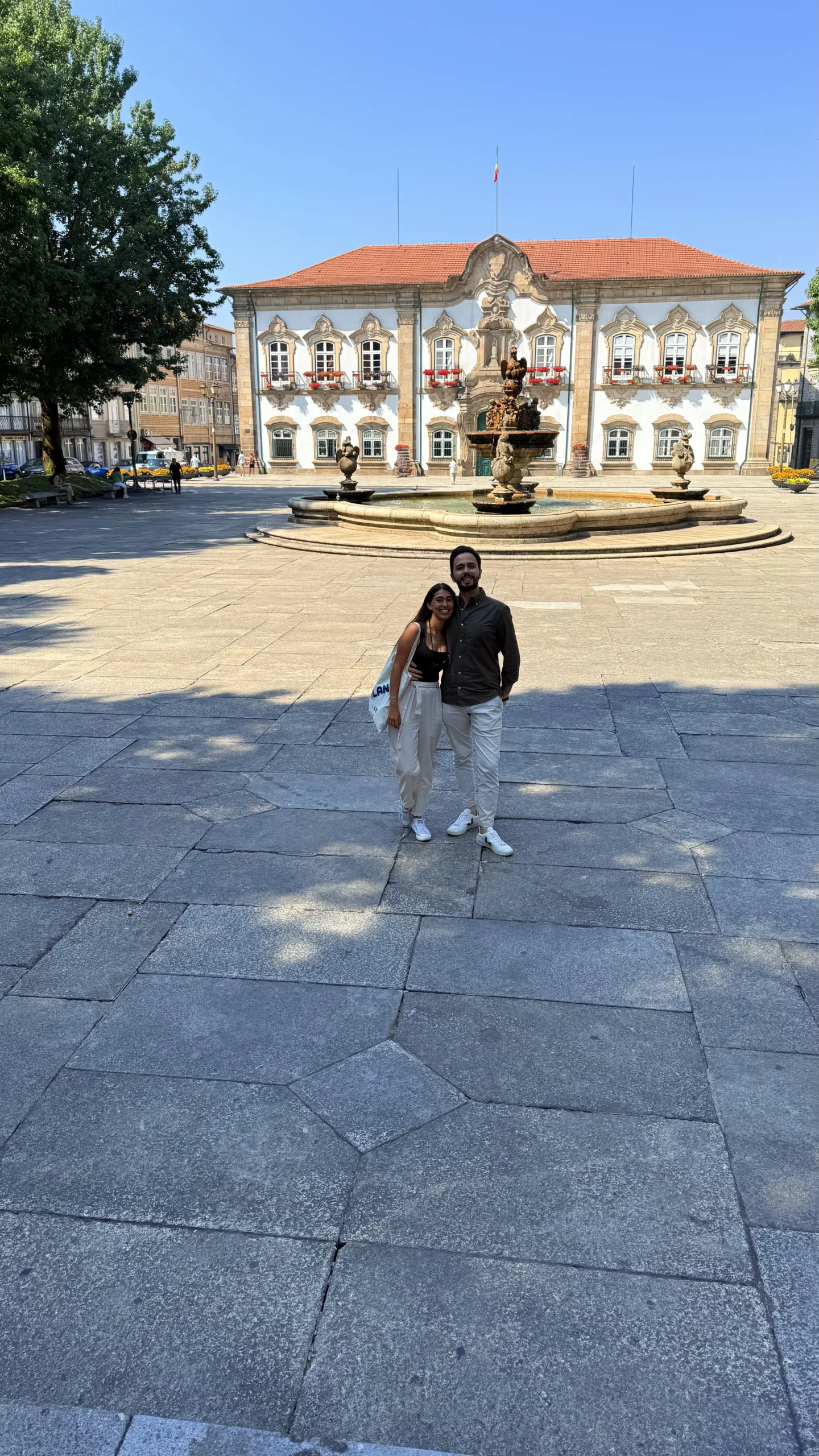 Al cruzar el arco, sentimos de inmediato el cambio, desde la amplitud de las avenidas extramuros, ahora nos encontrábamos con calles más estrechas y arquitectura antigua pero perfectamente conservada. Desde el arco subimos hasta la Praça do Município, donde un elegante edificio blanco de estilo casi colonial y con una gran fuente nos llamó la atención. La fuente, conocida como la de los pelícanos, en realidad las figuras parecían más águilas que pelícanos (la gente de la época no sabía como eran los pelícanos así que se creían todo😅).