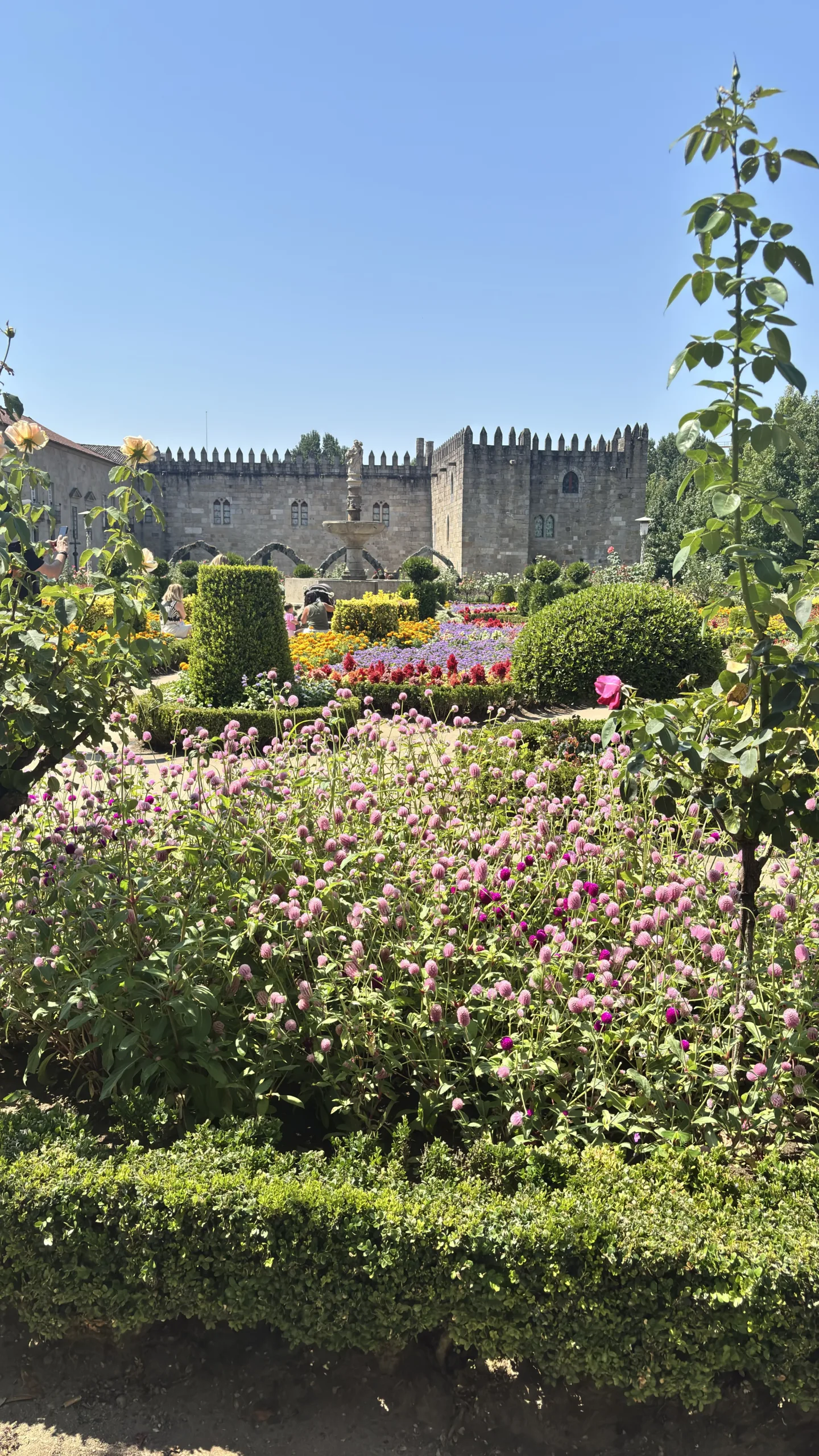 Ya en el Jardín de Santa Bárbara hemos de decir que nos encantó, fue uno de nuestros favoritos de Braga. Es un jardín pequeño parecido a la Rosaleda de El Retiro en Madrid. Esta totalmente cubierto de flores perfectamente cuidadas y al fondo se alza un castillo que convierte cualquier foto en postal. Justo enfrente hay unas sillas blancas con alas de ángel pensadas para hacer fotos preciosas (se nos ve super felices haciendo la turistada ¿cierto? 😂).